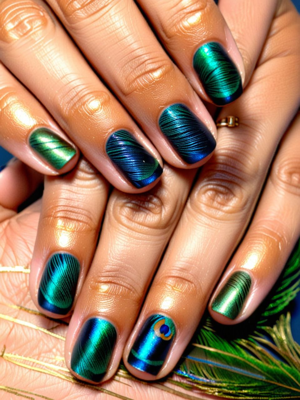 Peacock feather gel nail art with iridescent blues and greens on short, square nails, opulent and striking for bronze skin.