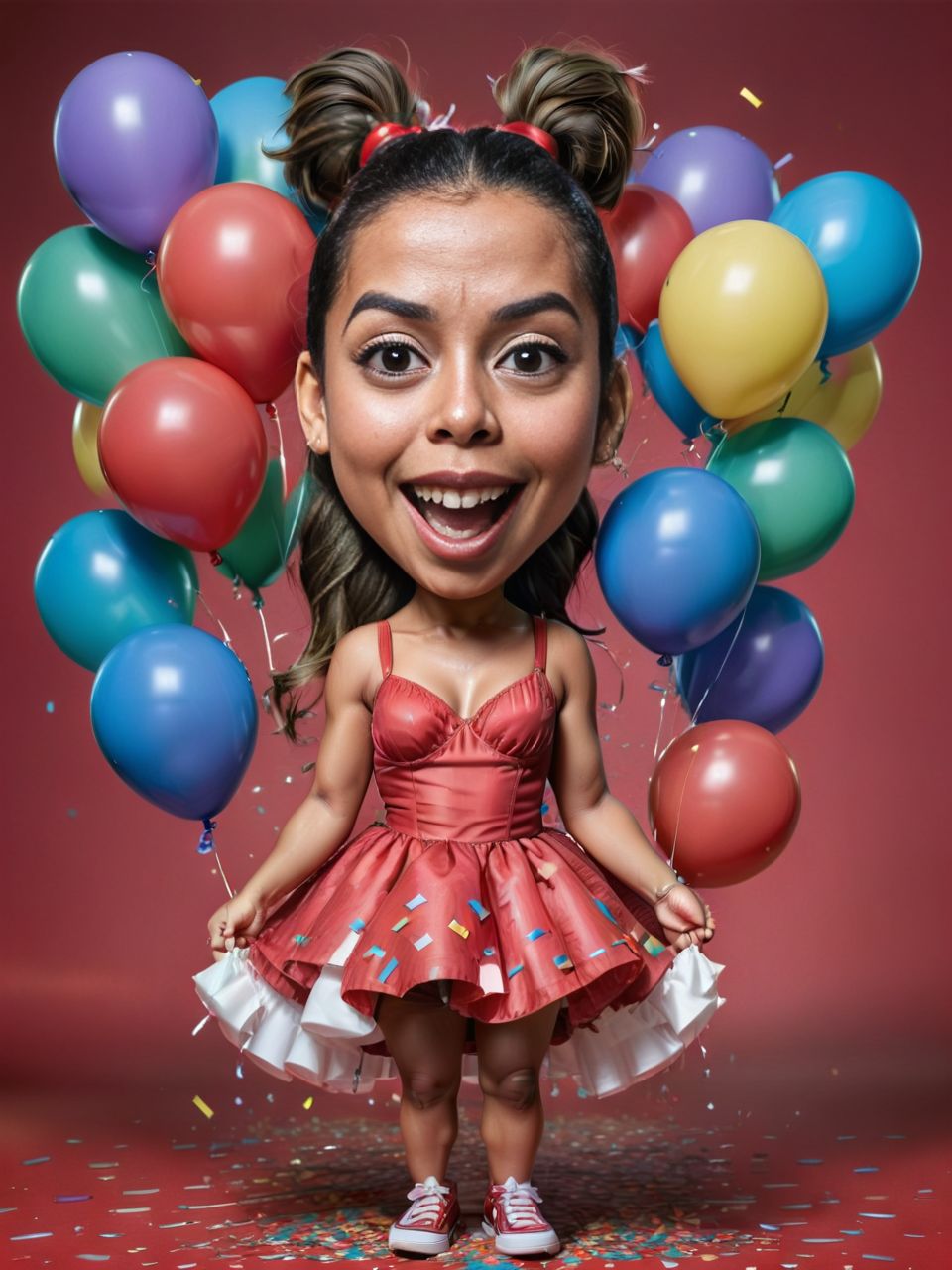 A playful birthday caricature of a young Latina girl with a ponytail, wearing a cute party dress, holding a bunch of balloons on a solid red background with confetti. funny,