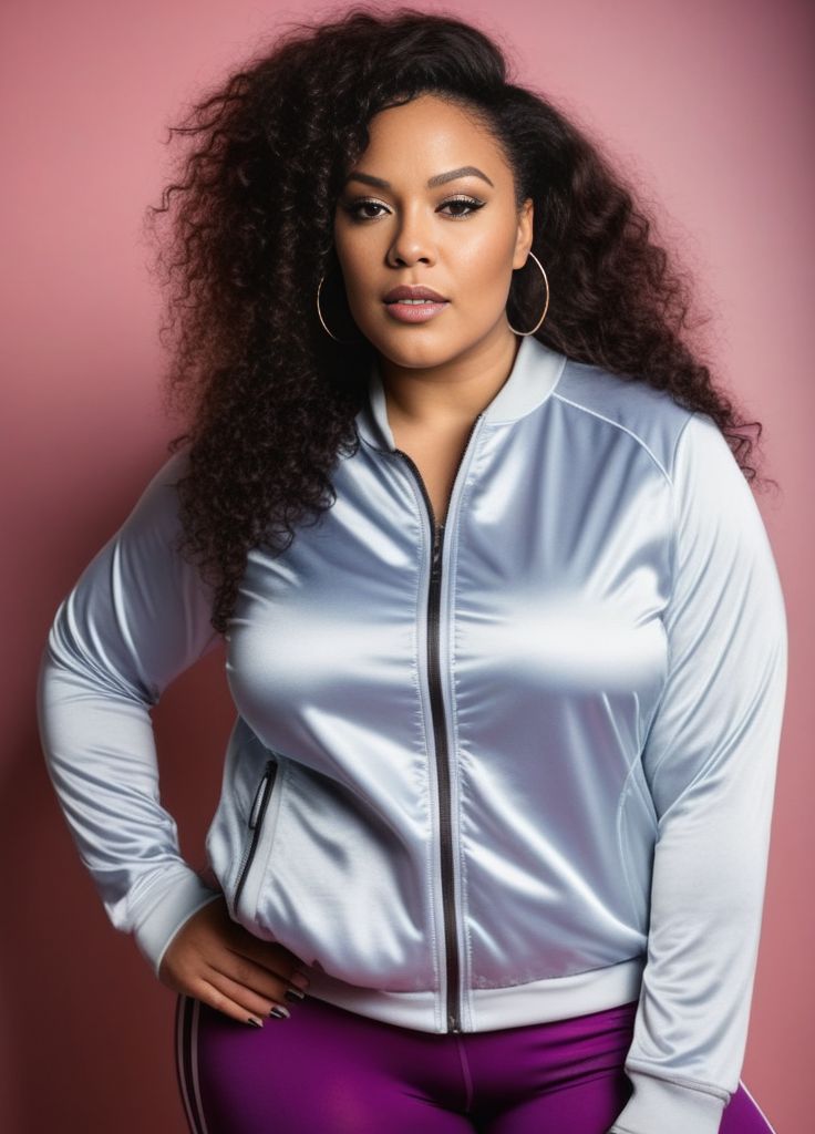 A plus-size woman of mixed race in a boudoir session, wearing a sporty outfit in a modern, urban studio.