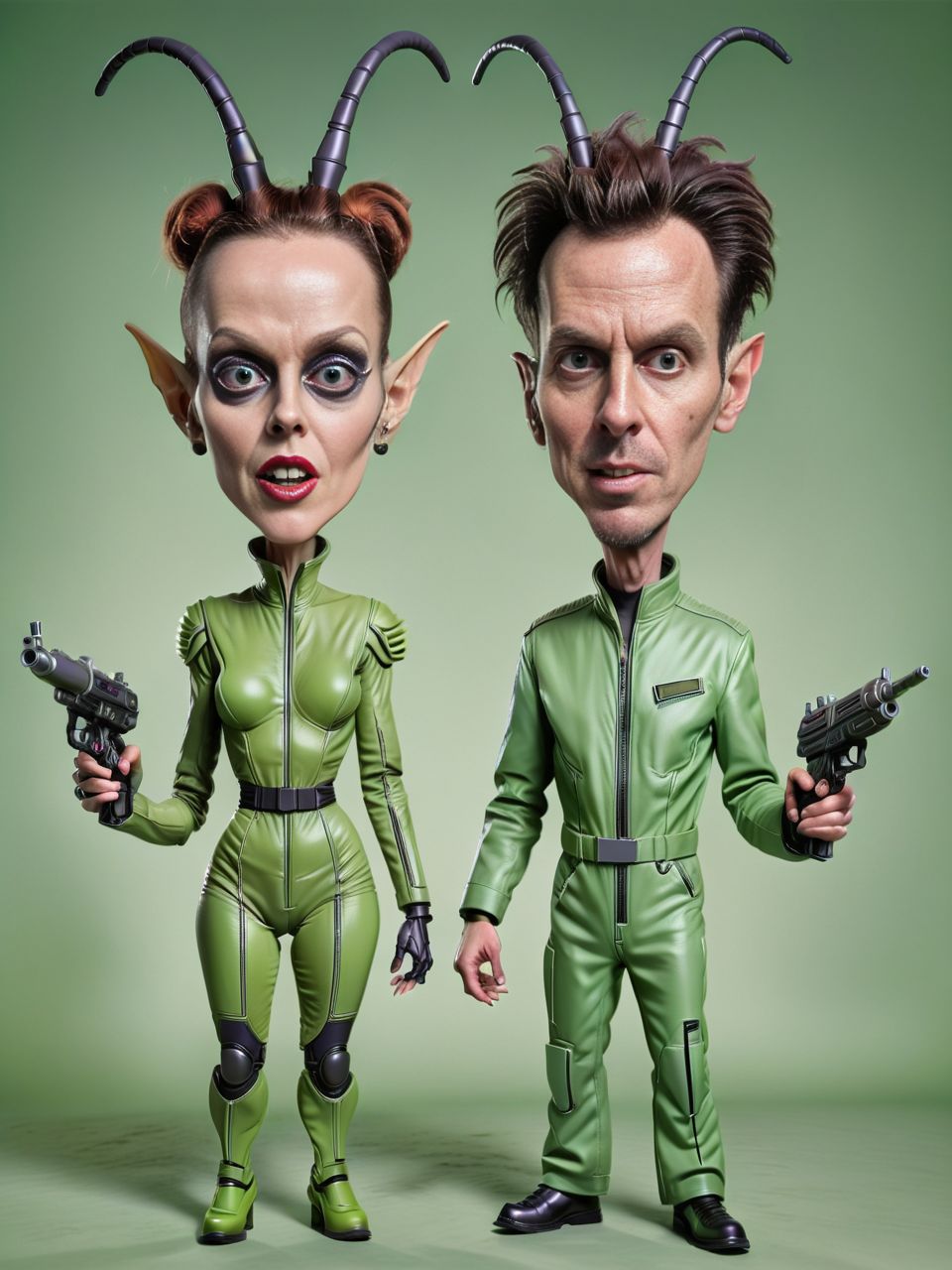 Step into a whimsical world where a couple dons retro sci-fi alien outfits complete with exaggerated antennas and ray guns, set against a vibrant lime green backdrop. Let your imagination soar with this quirky and futuristic caricature duo!