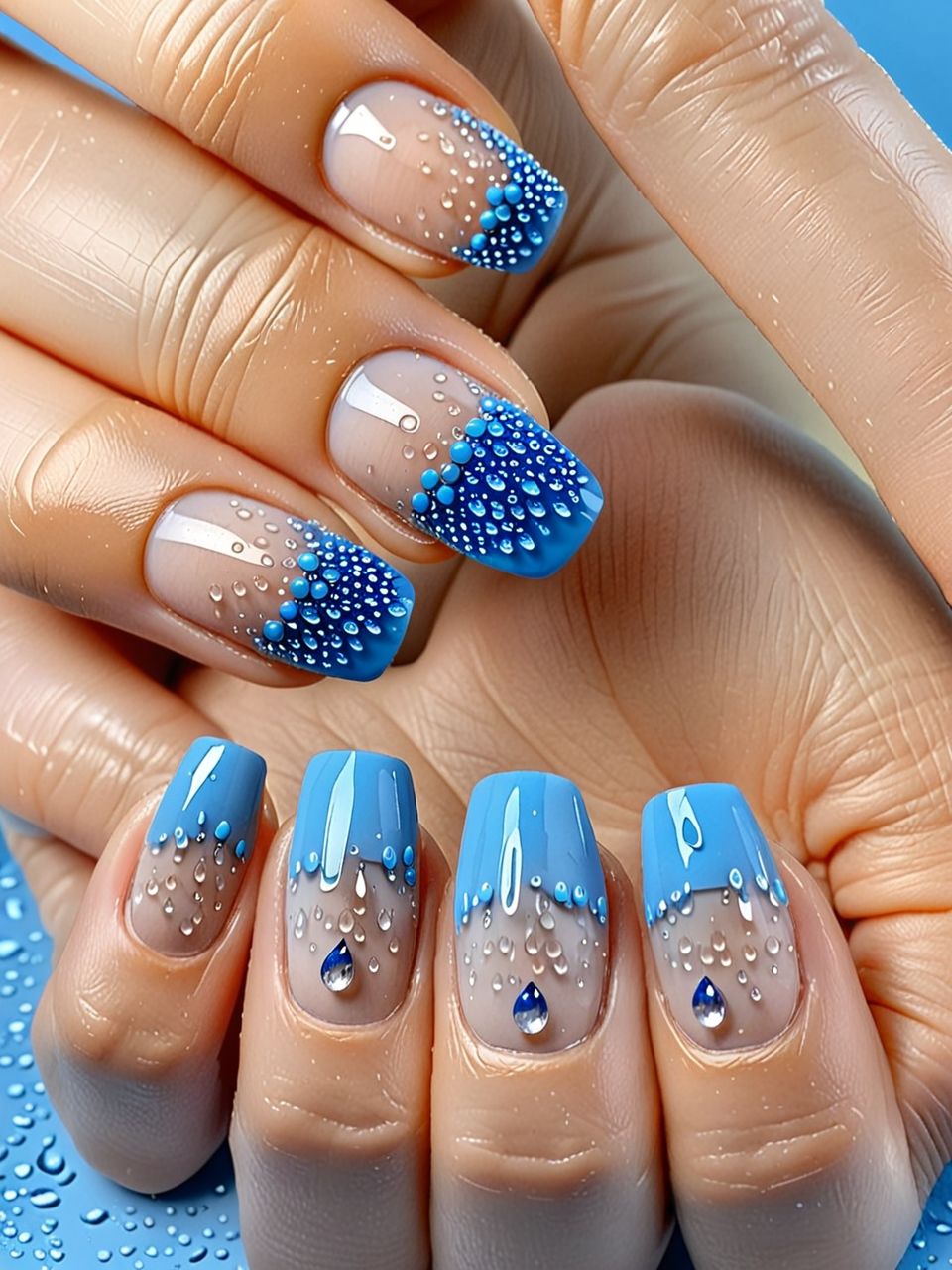 Elegant raindrop gel nail art featuring clear and blue droplets on long, oval nails, creating a tranquil and sophisticated look for individuals with fair skin tones.
