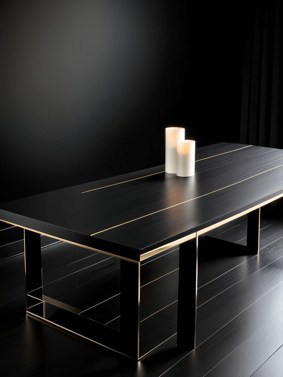 Check out this sleek and modern black table with clean lines and gentle highlights, set against a stylish black background. It creates an elegant and sophisticated display setting that’s perfect for any contemporary space.