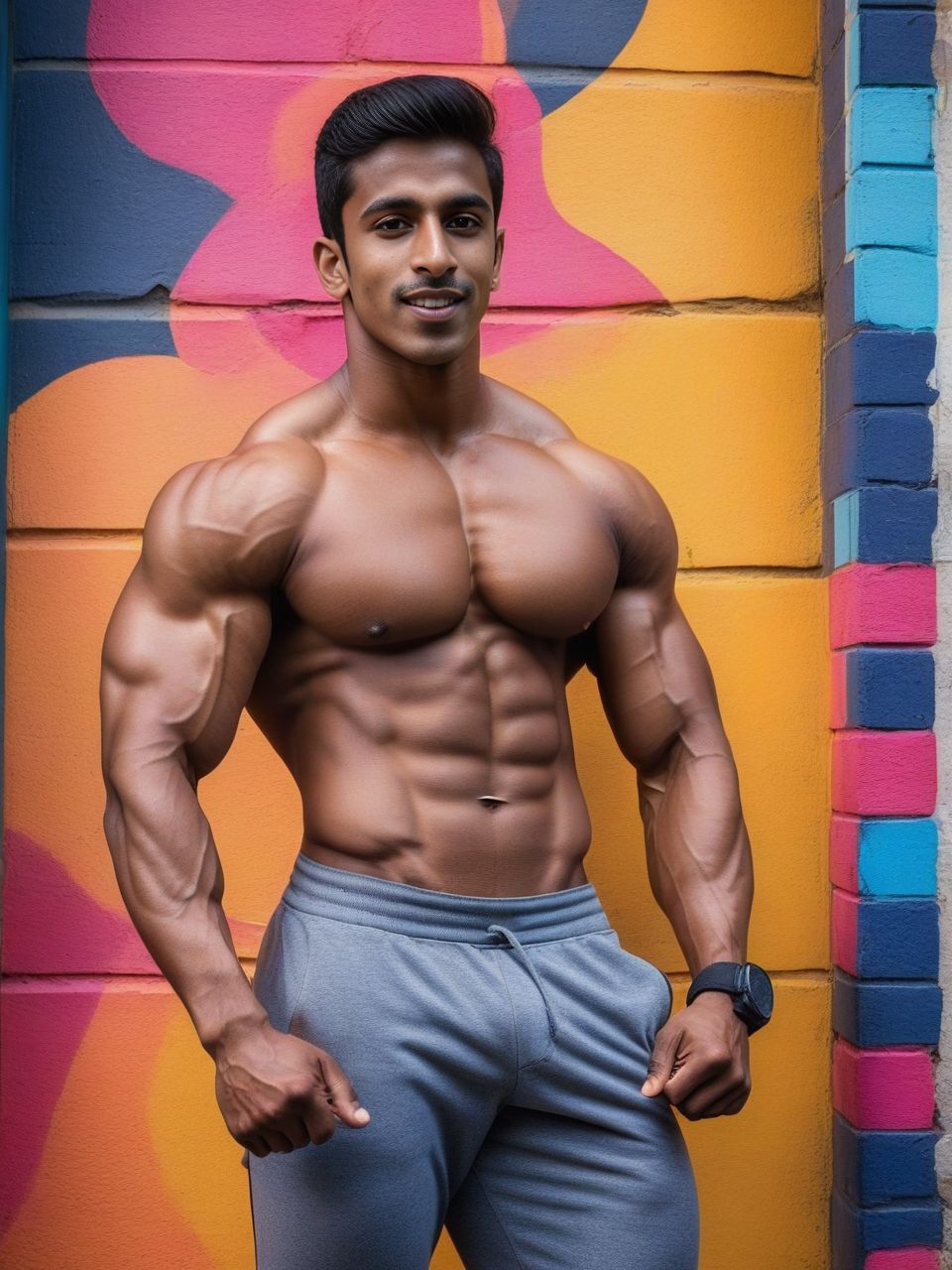 A strong and muscular South Asian young man strikes a powerful pose against a backdrop of colorful street art. The vibrant artwork adds an extra layer of energy and excitement to his already impressive physique. This image captures the beauty of strength and the fusion of art and athleticism.