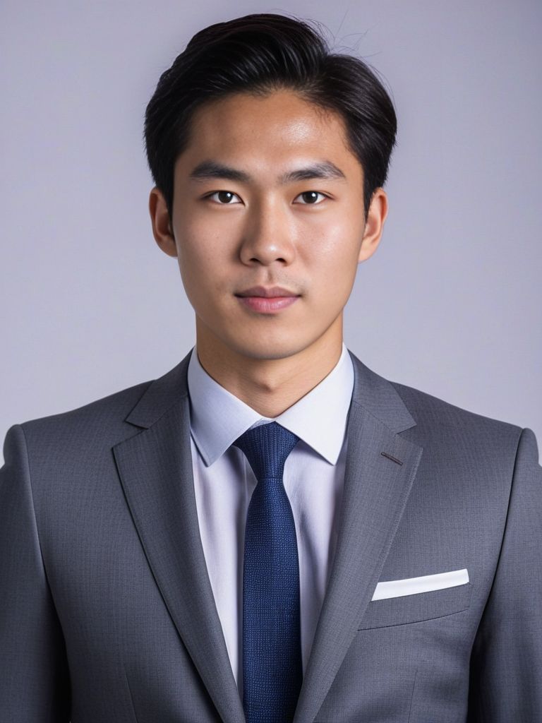 This is a studio portrait of a young East Asian man. He is wearing a grey suit and tie and is standing against a light background. The image shows the man’s full body. It is a professional and high-quality photograph that can be used for various purposes.