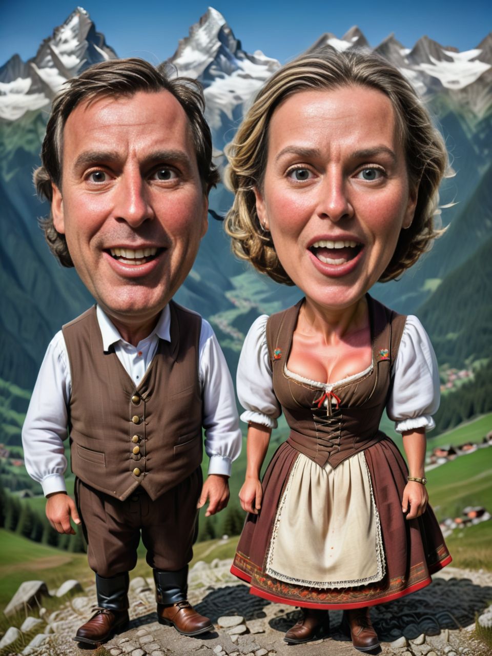 A funny caricature couple portrait of a Swiss couple in traditional attire, yodeling in the mountains