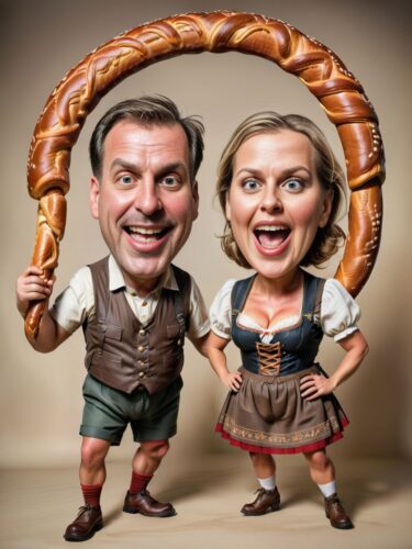 • Funny German Couple Caricature Dancing with Giant Pretzel