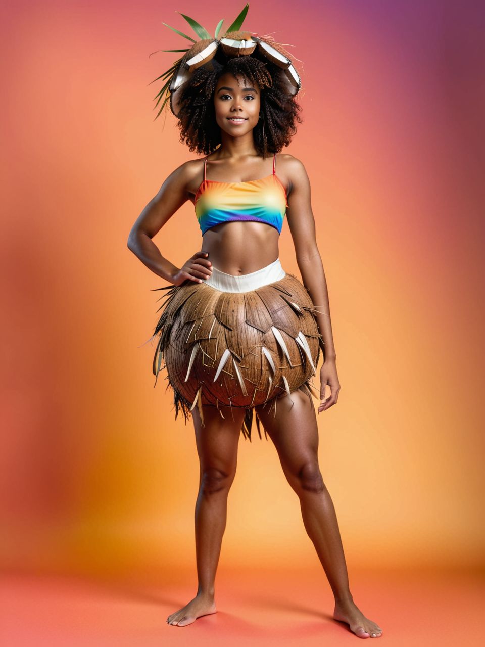 Experience the allure of creativity as a young woman embraces the whimsical charm of a coconut costume against a mesmerizing gradient backdrop. This unique portrayal captures the essence of joy and individuality, inviting viewers to explore a world of imagination and expression.