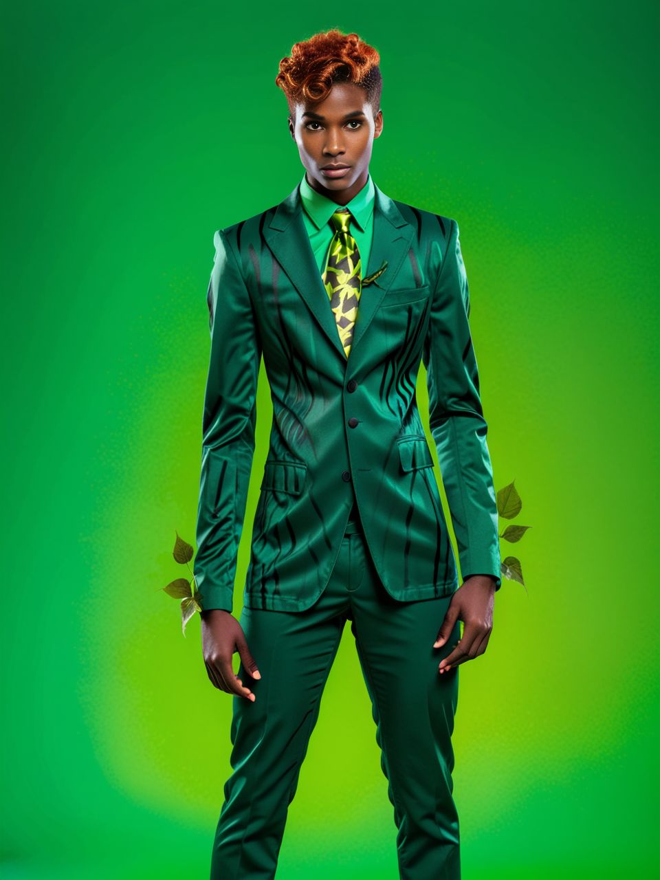 Discover the captivating portrayal of a young, slender Black man embodying the character of Poison Ivy against a stunning green gradient backdrop. This unique and creative cosplay captures attention with its vivid colors and striking presence. Explore the world of imagination and creativity with this mesmerizing image.