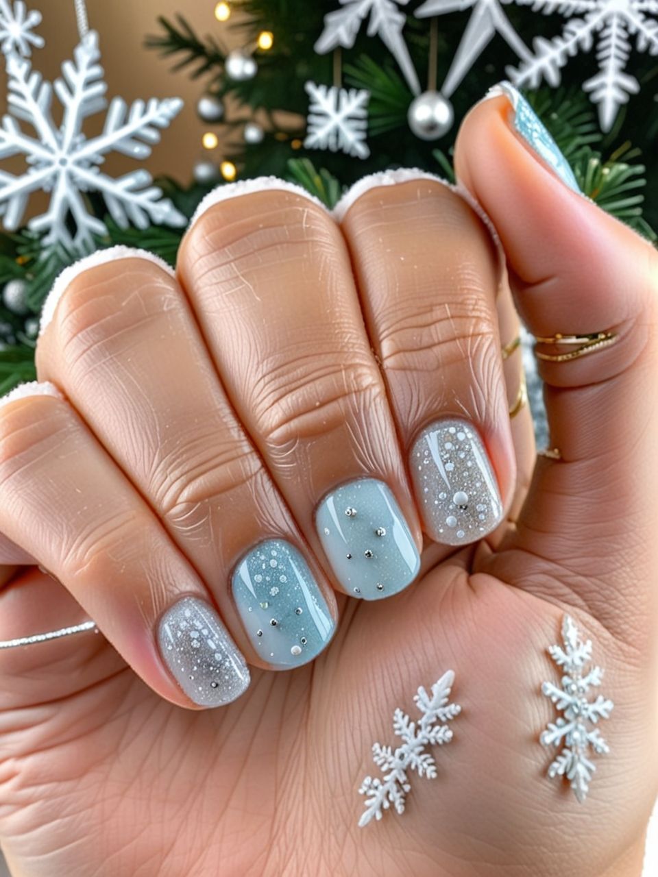 Sparkling snow and icicle nail art on long, oval nails, creating a winter wonderland effect for pale skin and festive nail inspiration.