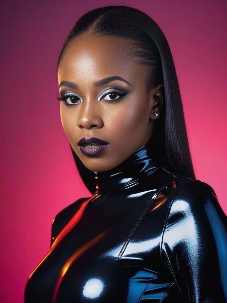 Young African American woman with straight hair in a black latex suit, half portrait, dynamic lighting.