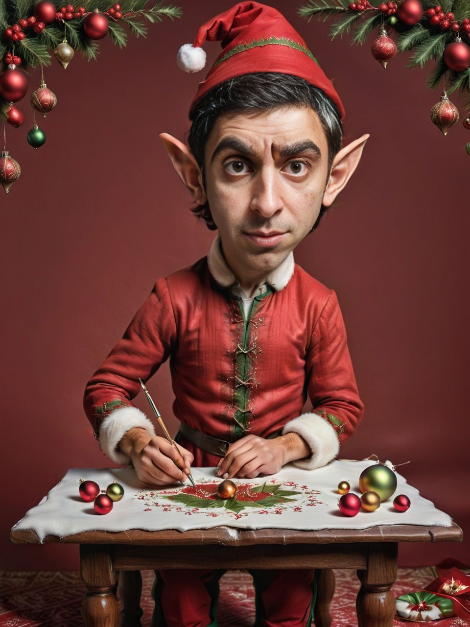 On a red Christmas canvas, a full-body caricature of a young Armenian male elf carefully painting delicate ornaments.