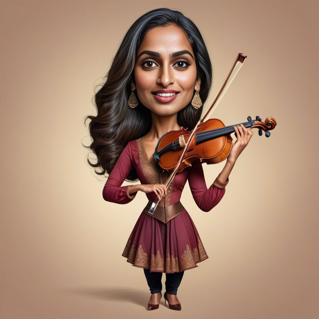 This is a caricature of a young beautiful South Asian woman playing an oversized violin. The image is full body and depicts the woman in a playful and whimsical manner. The vibrant colors and exaggerated features add to the charm of the caricature. This image would be perfect for music-related designs, artistic projects, or to add a touch of fun to any creative endeavor.