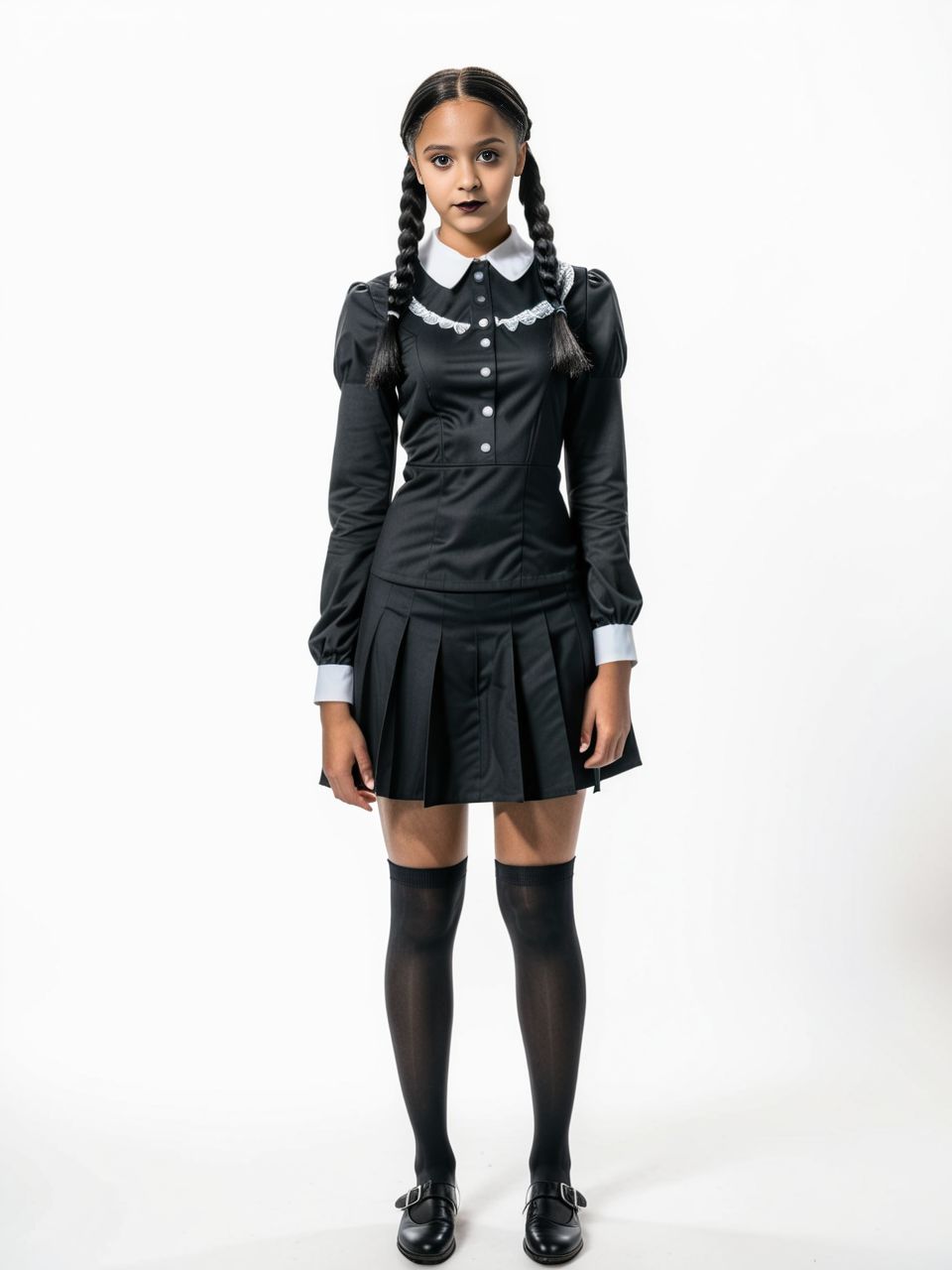 A young Black woman in a Wednesday Addams costume stands full body on a white background.