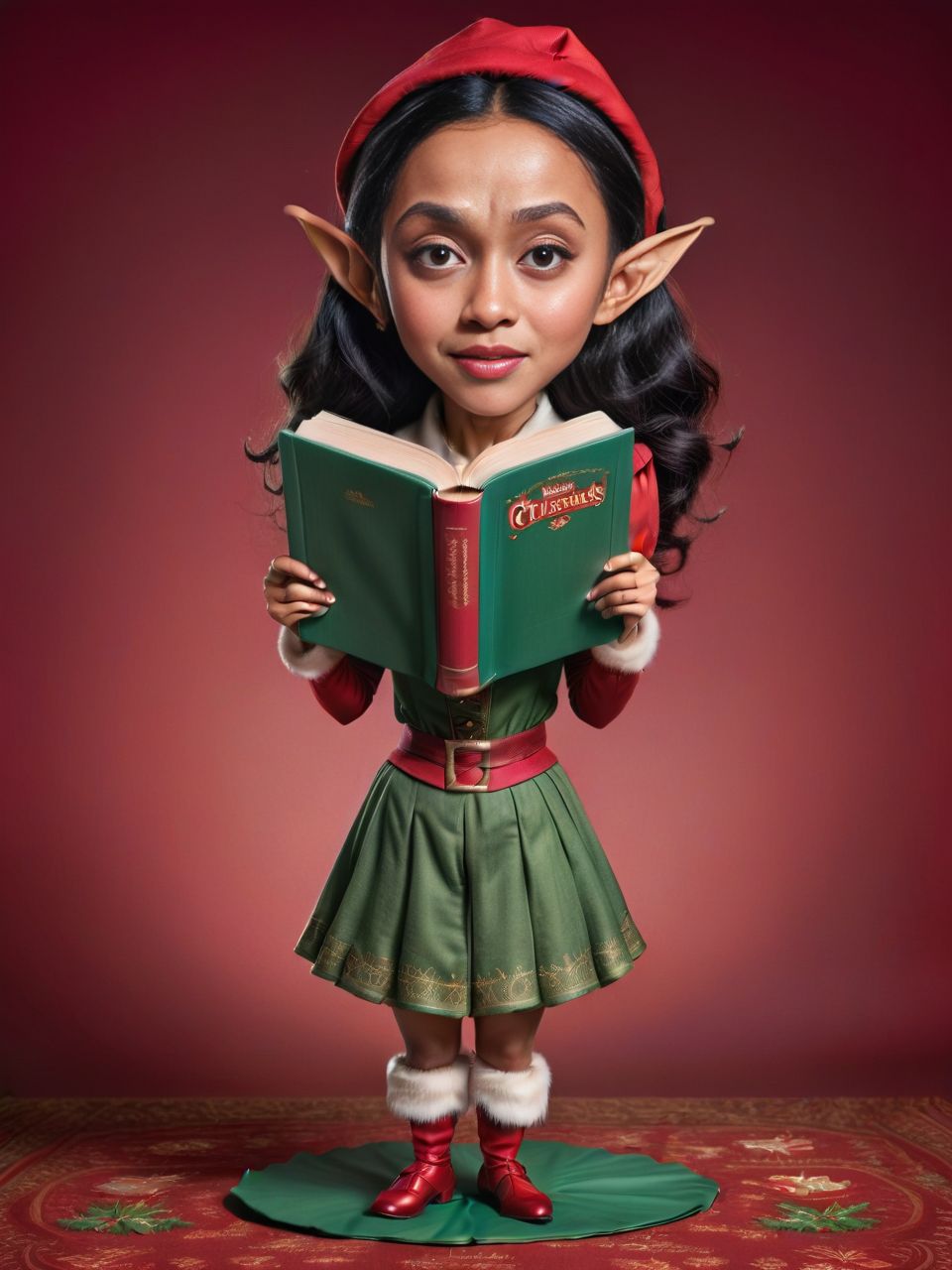 Against a ruby red background, a full-body caricature of a young Indonesian woman elf reading a giant Christmas storybook.