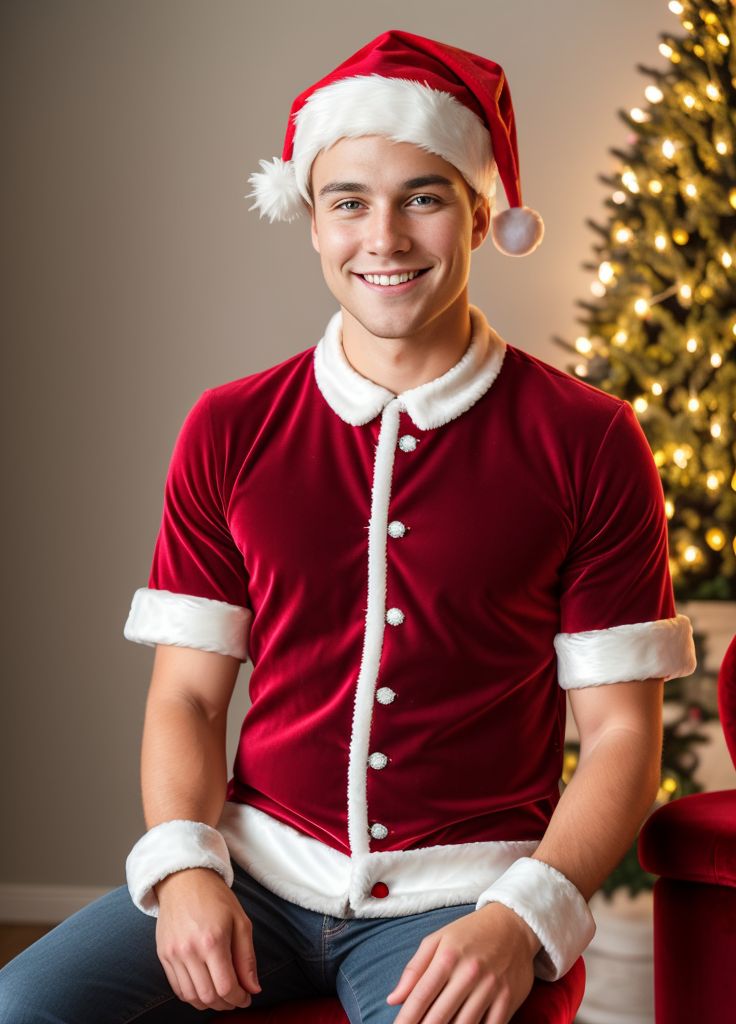 A young handsome man with a cheeky smile wearing a Santa hat, perched on a velvet stool with a backdrop of twinkling Christmas lights.