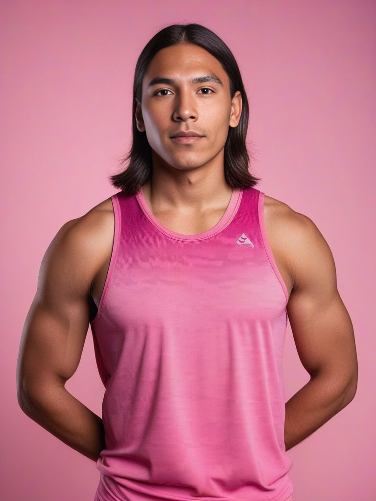 A young Native American man is captured in a professional studio setting wearing a pink yoga top. The lighting enhances his features and brings out the vibrant colors of his attire. This image is perfect for promoting diversity and inclusivity in the fitness and wellness industry.